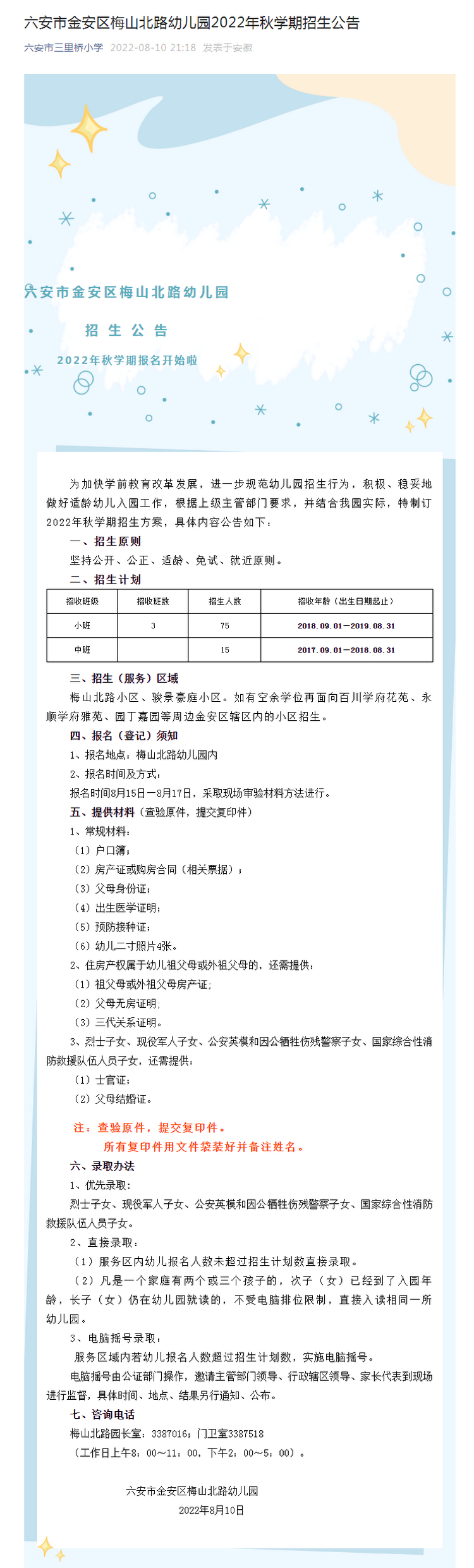 六安市金安区梅山北路幼儿园2022年秋学期招生公告