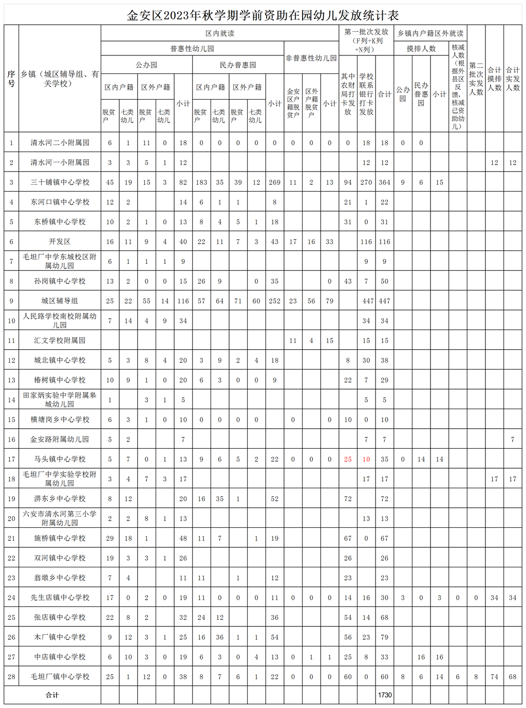 金安区2023年秋季学期拟享受学前教育资助发放分乡镇统计表