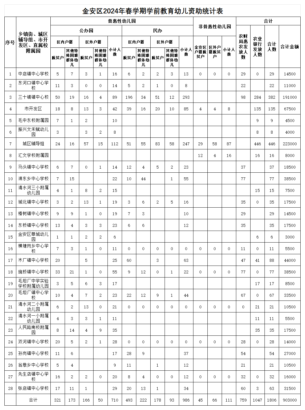 金安区2024年春季学期学前教育幼儿资助情况分乡镇统计表