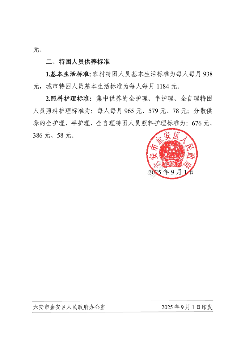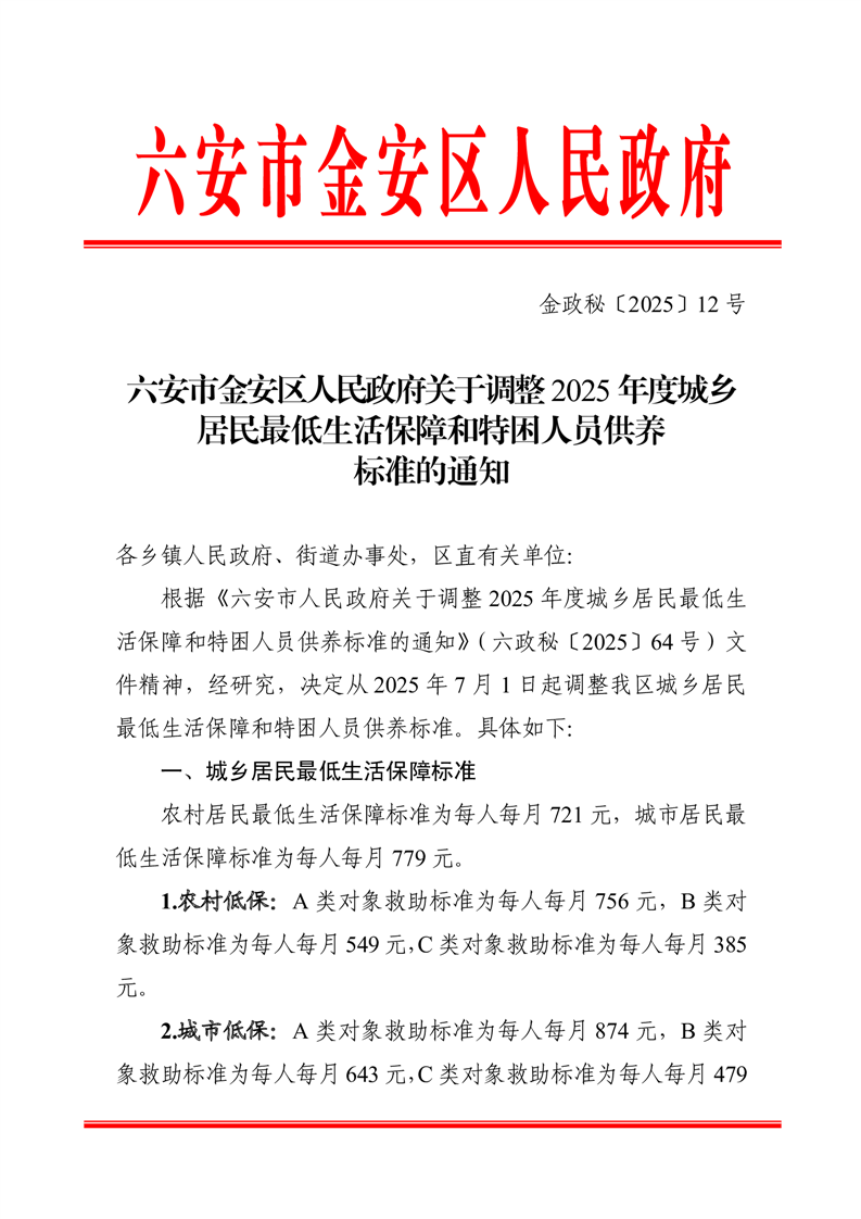 六安市金安区人民政府关于调整2025年度城乡居民最低生活保障和特困人员供养标准的通知