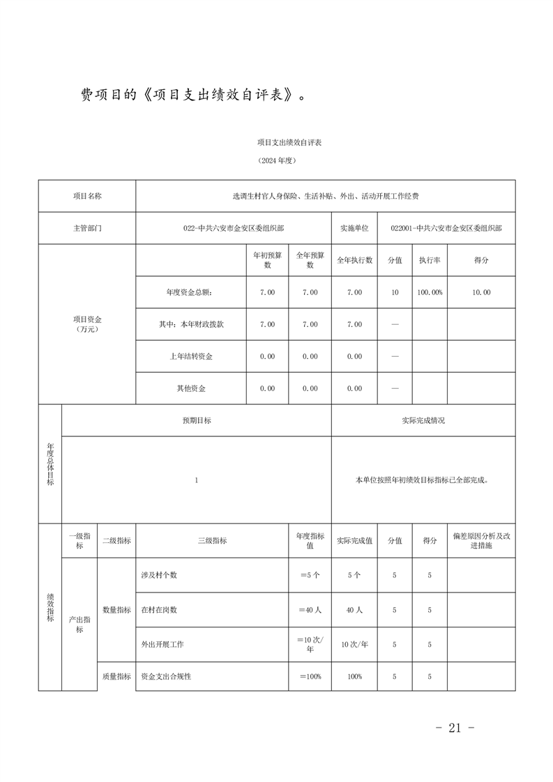 附件2:2024年度中共金安区委组织部选调生村官人身保险、生活补贴、外出及活动开展工作经费项目绩效评价报告项目绩效自评报告.pdf