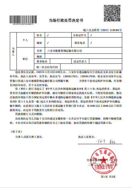 关于六安市德服货物运输有限公司行政处罚决定书(道路运输监督检查)