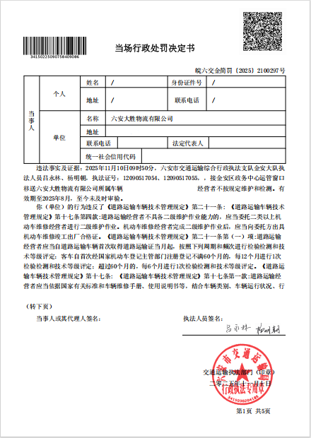 关于六安大胜物流有限公司行政处罚决定书(道路运输监督检查)
