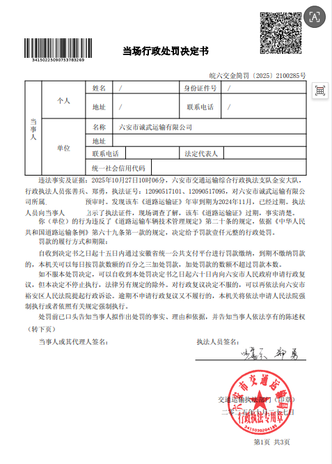 关于六安市诚武运输有限公司行政处罚决定书(道路运输监督检查)