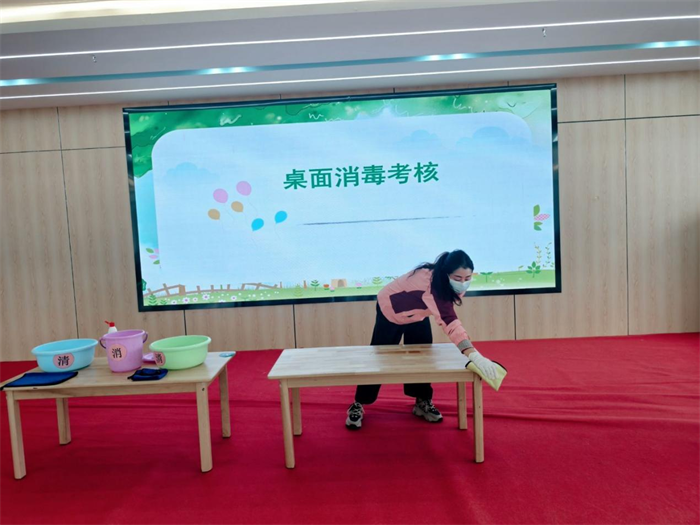 随后进入核心考核环节:先是理论考核,试卷围绕幼儿卫生保健、消毒规范、应急常识等核心内容展开,检验保育员的专业知识储备;紧接着是实操考核,选手们依次完成“桌面消毒”与“整理床铺”两项任务。桌面消毒严格遵循“清洁—消毒—清洁—擦干”四步流程,动作规范且细节到位;整理床铺时,抖被、叠角、铺枕一气呵成,被褥方正平整,尽显日常积累的扎实功底。评委团全程从操作规范性、熟练度、细节把控度等维度综合评分,确保公平公正。经过激烈角逐,陈德梅老师脱颖而出斩获一等奖。