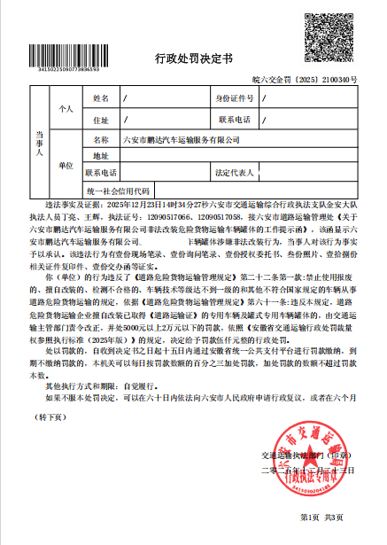 关于六安市鹏达汽车运输服务有限公司行政处罚决定书(道路运输监督检查)