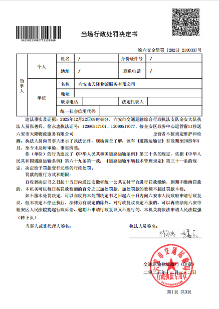 关于六安市天隆物流服务有限公司行政处罚决定书(道路运输监督检查)