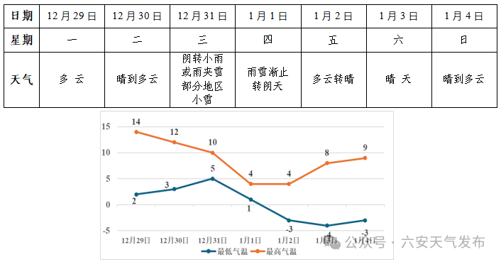 31日到1月1日我市有一次降水过程,其中31日阴转小雨或雨夹雪,山区雨夹雪或雪,1日降水渐止转阴天;其他时段以晴到多云天气为主。