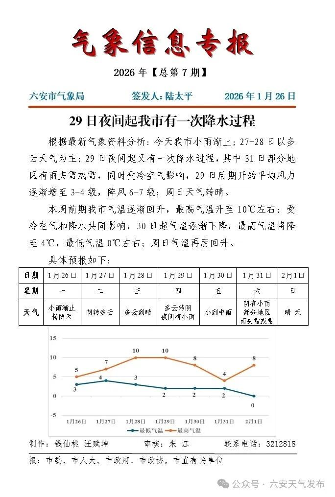 今天我市小雨渐止;27-28日以多云天气为主;29日夜间起又有一次降水过程,其中31日部分地区有雨夹雪或雪,同时受冷空气影响,29日后期开始平均风力逐渐增至3-4级,阵风6-7级;周日天气转晴。本周前期我市气温逐渐回升,最高气温升至10℃左右;受冷空气和降水共同影响,30日起气温逐渐下降,最高气温将降至4℃,最低气温0℃左右;周日气温再度回升。