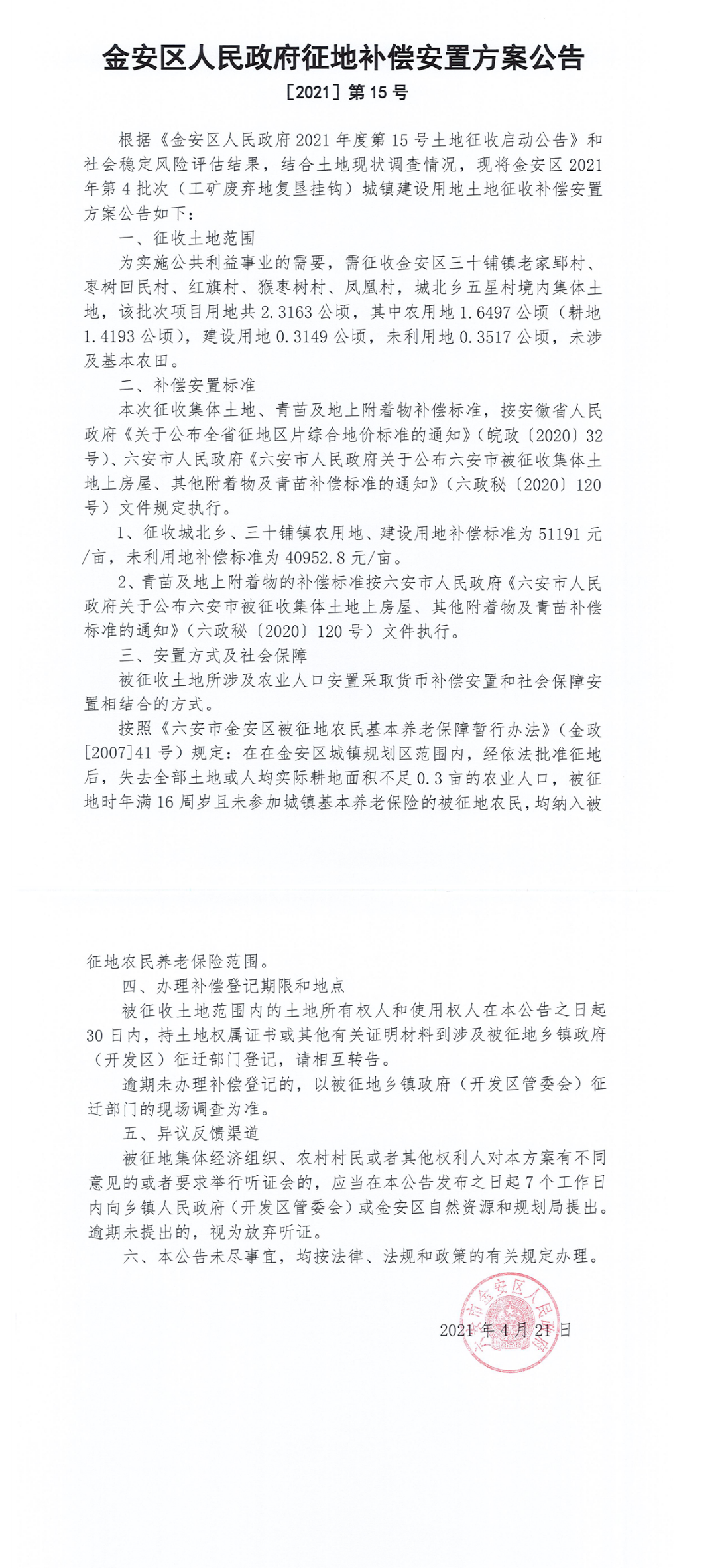 金安区2021年第4批次(工矿废弃地复垦挂钩)城镇建设用地土地征收补偿安置方案公告