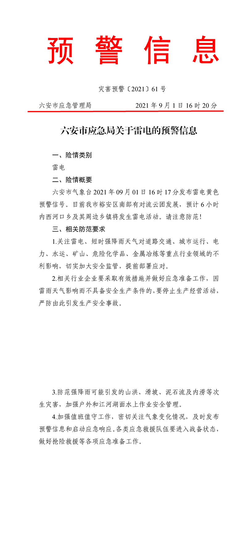 六安市应急局关于雷电的预警信息