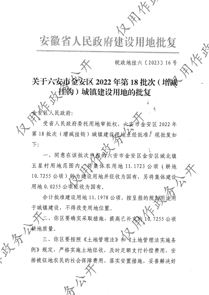 关于六安市金安区2022年第18批次(增减挂钩)城镇建设用地的批复(皖政地挂六〔2023〕16号)