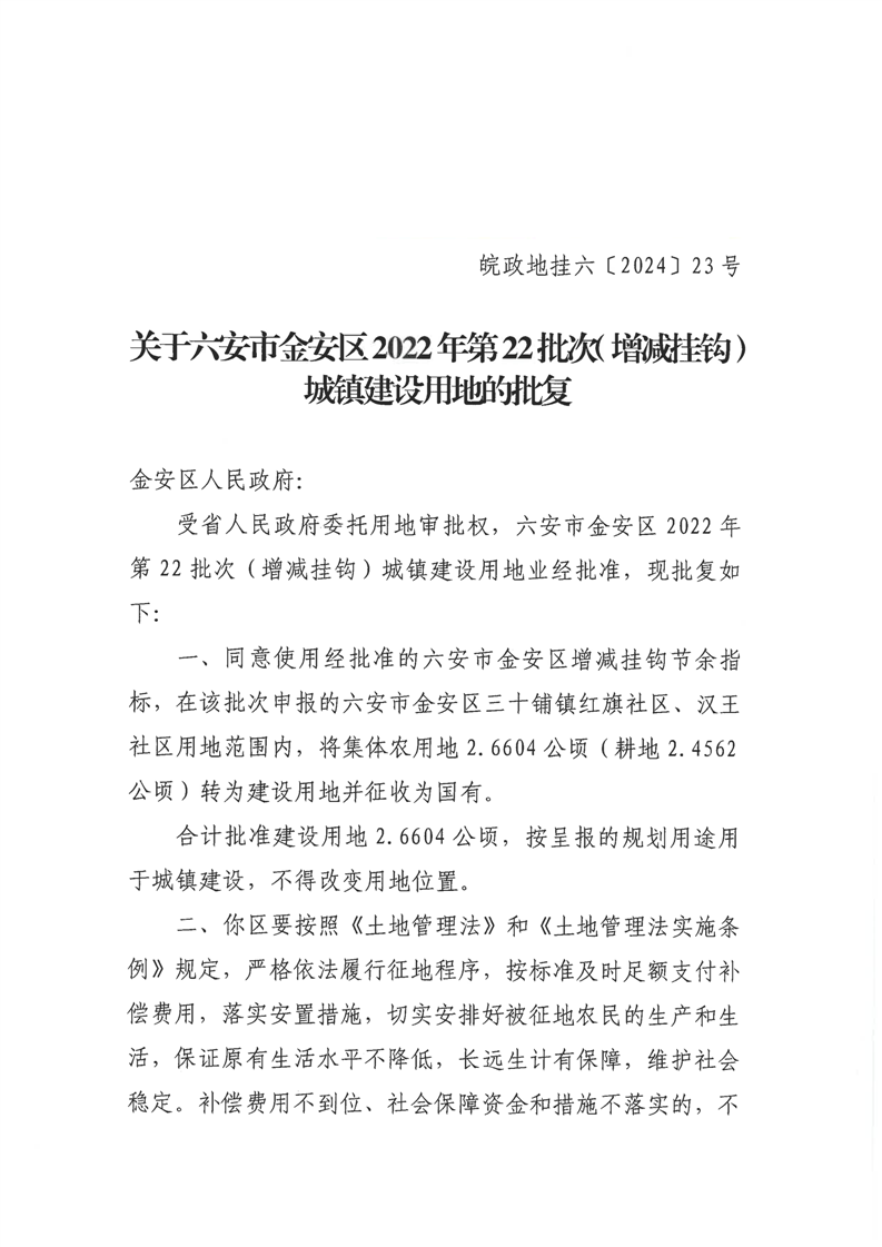 关于六安市金安区2022年第22批次(增减挂钩)城镇建设用地的批复