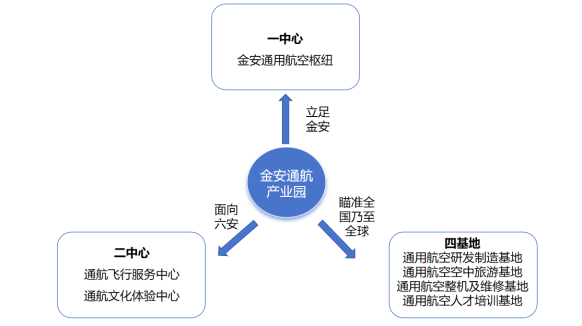以“四基地”为定位。依托安徽高校及其他科研院所发展通用航空整机及关键技术研发,抢占通航技术高地,利用金安经济开发区高端装备制造产业优势,积极打造安徽通用航空研发制造基地;依托六安市及安徽省一流生态环境及丰富旅游资源发展通航旅游,形成六安空中旅游网络,打造安徽通用航空空中旅游基地;引进具有民航飞机改装及维修资质企业,开展 MRO及飞机改装项目,抢占通航改装及维修市场,打造安徽通用航空改装及维修基地;积极开展通航人才培训项目,建设飞行培训学校,开展私、商照培训,发展高级维修及改装技术人员、空管、运营、乘务等通航人才培训项目,打造安徽通用航空人才培训基地。
