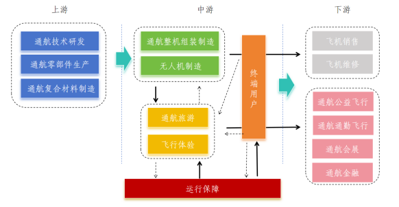 以通航整机组装制造及无人机制造为核心,整合上游通航技术研发、通航零部件及复合材料制造企业,下游飞机销售及改装维修企业,形成通航研发制造产业链,打造国内一流的通航研发制造基地。