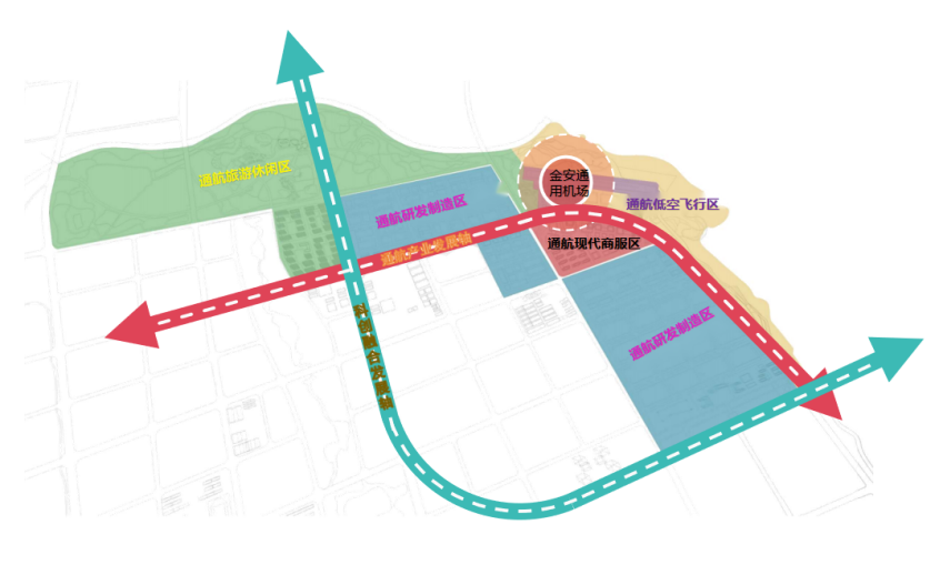 金安通用机场发展核心。以金安通用机场为核心,尽快建立和完善机场六大功能区域:飞行区、航站区、货运区、机务区、工作区和陆侧的集疏运系统,并和应流集团形成业务对接,形成园区的第一个发展核心。