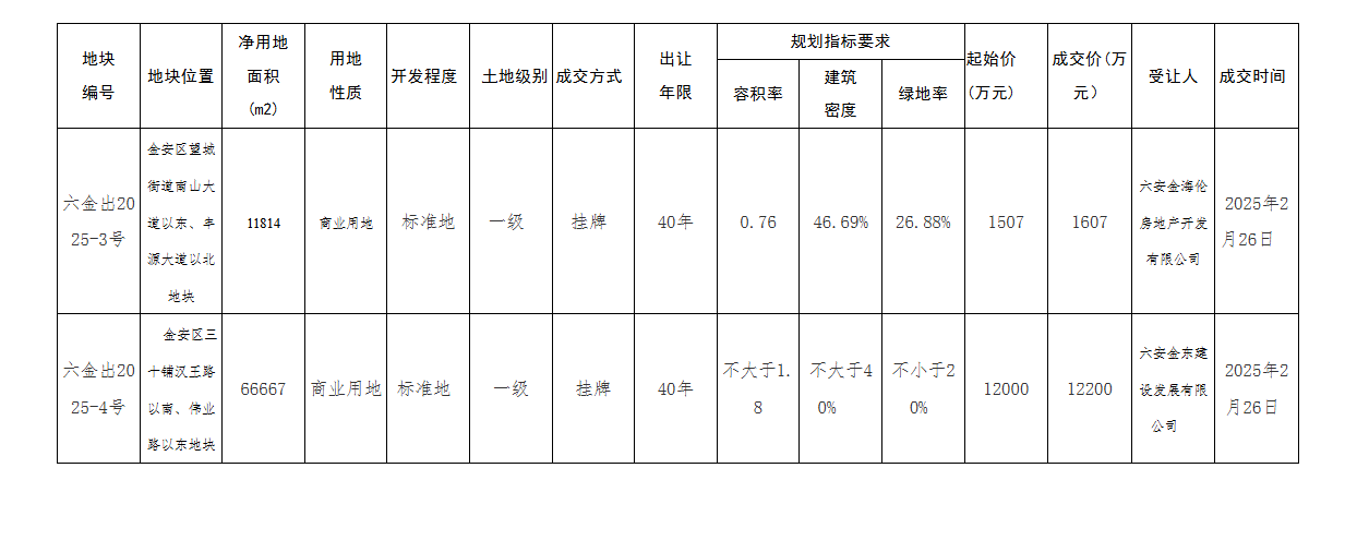 六安市金安区国有建设用地使用权公开出让结果(六金自然资告〔2025〕2号)