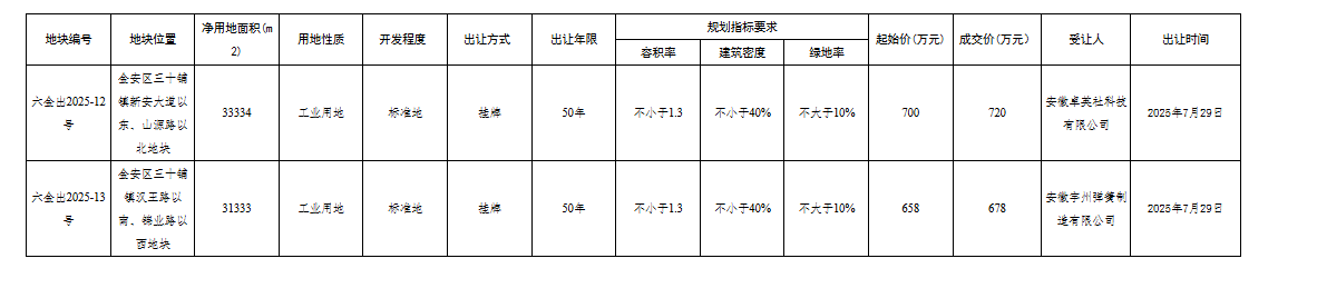 六安市金安区国有建设用地使用权公开出让结果(六金自然资告〔2025〕7号)