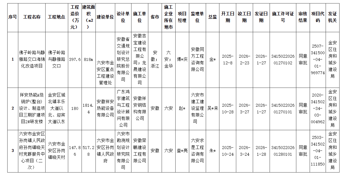 六安市金安区住房和城乡建设局行政许可信息公示表(三)
