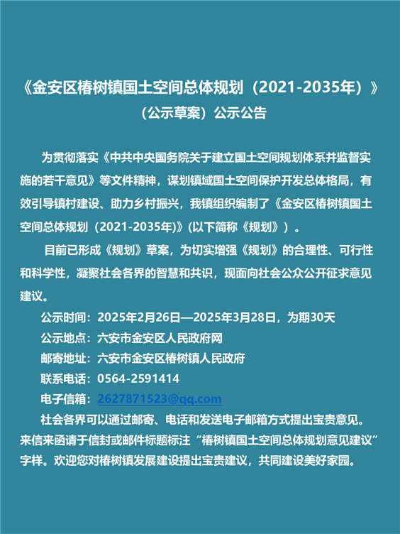 根据《中共中央国务院关于建立国土空间规划体系并监督实施的若干意见》《安徽省自然资源厅关于进一步加强国土空间规划编制工作的通知》等文件要求,六安市金安区椿树镇人民政府组织编制了《六安市金安区椿树镇国土空间总体规划(2021-2035年)》(以下简称《规划》),目前已形成《规划》草案。为广泛征求并听取社会公众意见,进一步提高规划成果质量,现将《规划》公示草案向社会公开公示,欢迎社会各界积极参与,提出宝贵意见与建议!