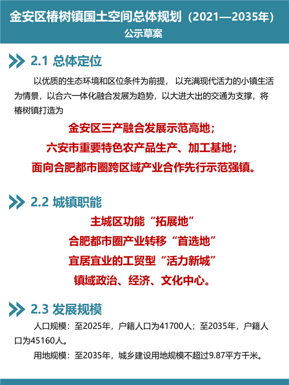 5.总体定位。以优质的生态环境和区位条件为前提,以充满现代活力的小镇生活为情景,以合六一体化融合发展为趋势,以大进大出的交通为支撑,将椿树镇打造为金安区三产融合发展示范高地,六安市重要特色农产品生产、加工基地:面向合肥都市圈跨区域产业合作先行示范强镇。
