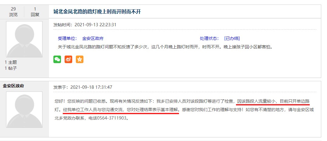 关于城北金凤北路的路灯晚上时而开时而不开的问题,回复我的是:因该路段人流量较小,目前只开单边路灯。实际情况是有时那段路灯两边都不开。第二回复的是:单位工作人员与您沟通交流,对处理结果表示基本理解。感谢对工作的理解与支持!我想问的是该部门什么时候联系我了。