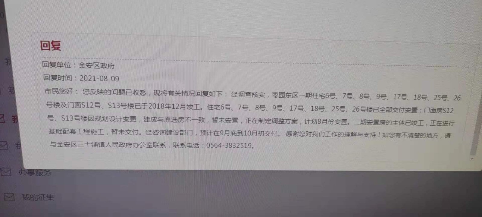 回复单位:金安区政府