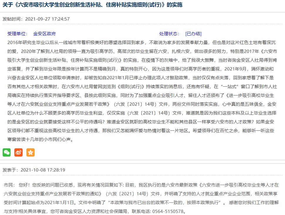 尊敬的领导,您好!关于《六安市吸引大学生创业创新生活补贴、住房补贴实施细则(试行)》的实施办法,据我了解,在六安市仍在实行。但在金安区人社局这边申请和咨询过程中,发现已经停止该实施办法的施行,并实行新的政策--《进一步吸引高校毕业生等人才在六安就业创业支持重点产业发展若干政策》(六发〔2021〕14号)文件。并被告知明确了支持的人才就业重点产业企业范围,相关政策享受时间计算起始点为2021年1月1日。文件中明确了“本政策与我市已出台的政策不一致的,按照本政策执行”。 然而在两个政策中,反应的享受对象并不相同,所以我对“本政策与我市已出台的政策不一致的,按照本政策执行”,这句话解读有误差,相关问题我也在金安区政府平台反馈过,回复与此类似,比较官方的解释,我还不能完全理解,恳请领导给予确定。为感!