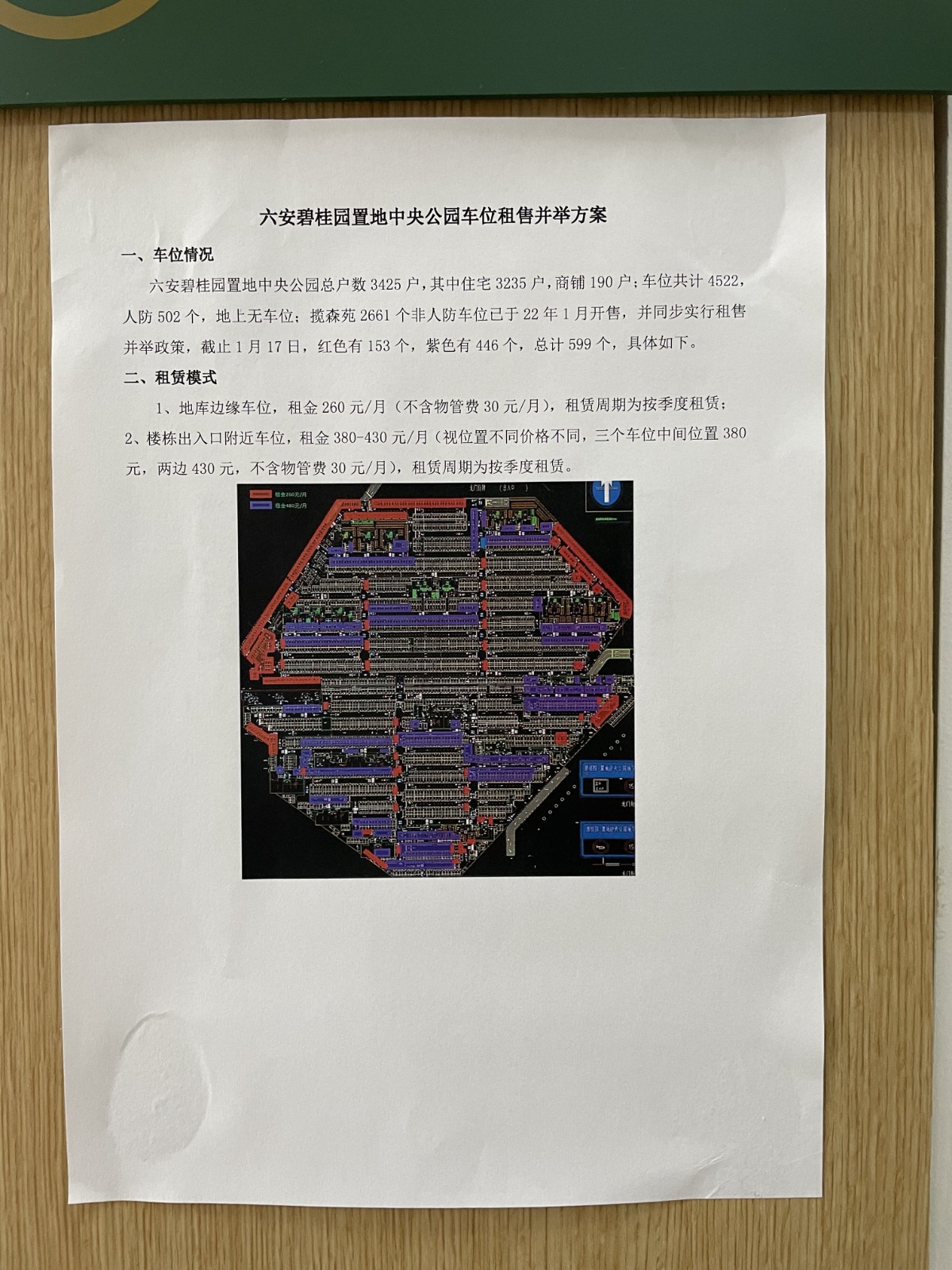 2、租赁价格严重偏离市场价格:白云商厦地下停车位月租金230元(含服务收费30元,下同),浙东商贸城是210元,碧桂园城市之光是180元,金安丽景苑是150元,紫御府高达340元遭到约谈,丹霞公馆280元,阳光巴黎春天210元,周边小区:东方蓝海180元,长安城150元。目前碧桂园·置地中央公园销售告知的租赁价格为410-460元/月(含服务费),是六安市平均水平的3倍,严重偏离市场价格。