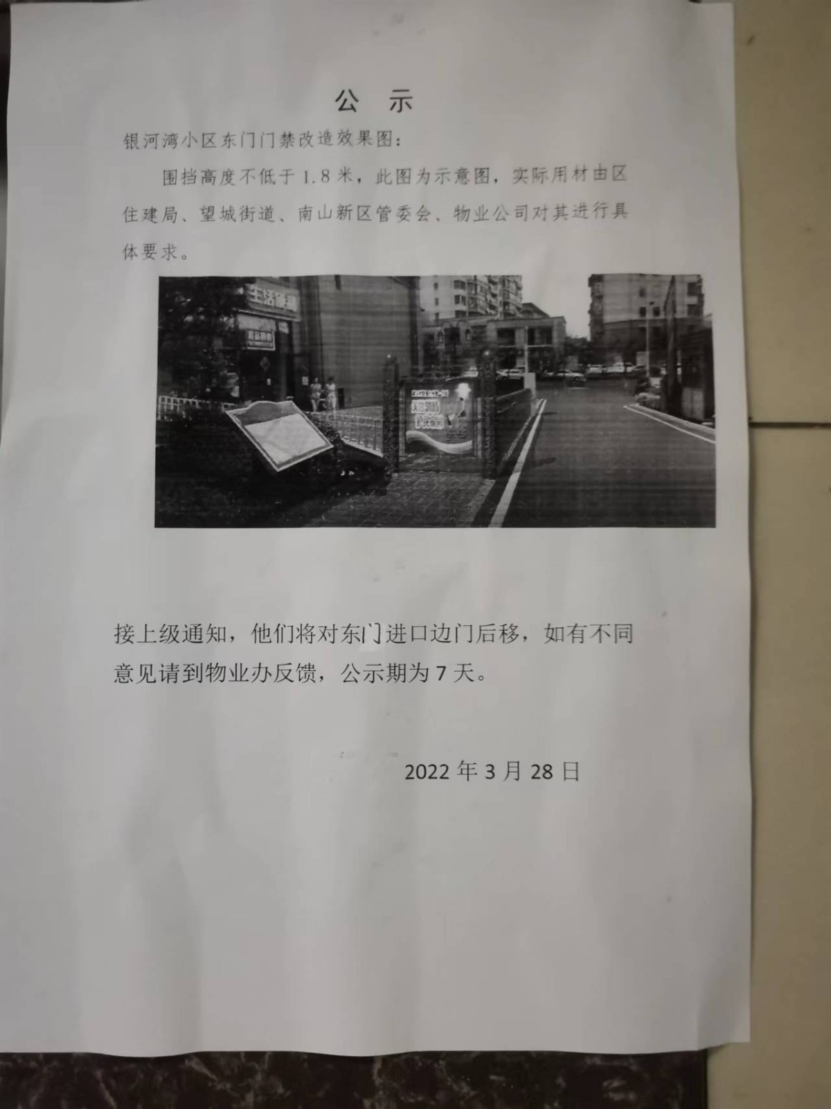 您好!您反映的问题已收悉,感谢您对公示方案提出的意见和建议,现反馈如下:银河湾原东门拟准备向后移动的方案目前正在公示中,拟定该方案原因为:前期东门商铺因小区原门禁长期关闭导致无法正常营业,市自然资源和规划局建设工程管理科给出建议为改造门禁位置,本着合法合理公平公开的原则,区住建局、望城街道、南山新区管委会、小区物业经研究后拟定出银河湾东门门禁改造具体方案并公示。在公示期内收到关于该方案的所有诉求,我单位均会认真考量、优化方案,以维护小区业主合法权益。4月2日,经我单位工作人员与您沟通联系,您对处理结果表示基本理解。感谢您对我们工作的理解与支持!如您有不清楚的地方,请与南山新区规划建设环保局联系,联系电话:0564-3260310。