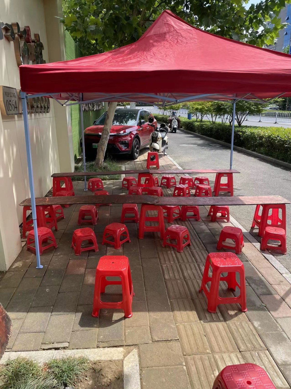 为方便郝岗路工地工人中午吃饭问题,经现场查看,在不影响交通及行人安全的情况下,郝岗路工地大门旁盒饭摊点,在规定时间内允许出摊,已在我大队备案。