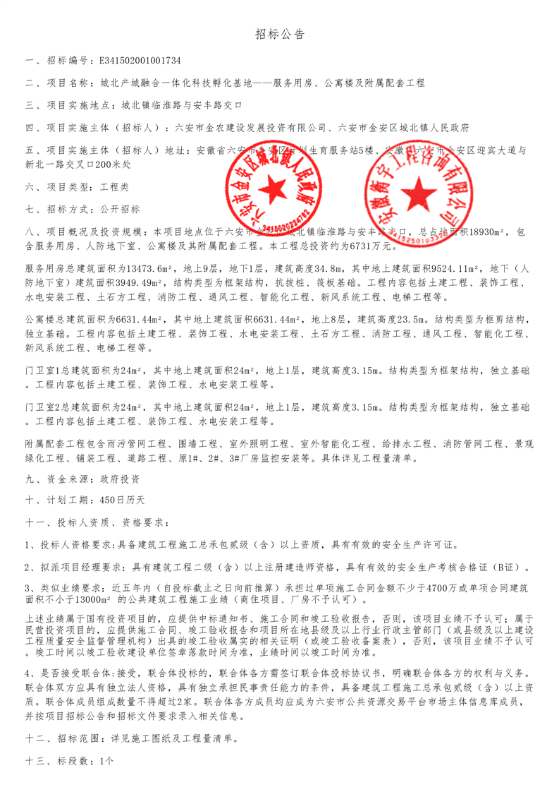 城北产城融合一体化科技孵化基地——服务用房、公寓楼及附属配套工程