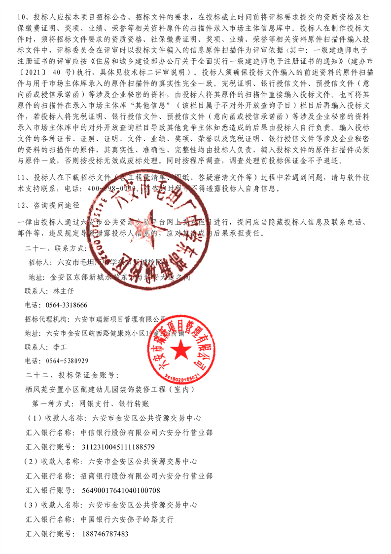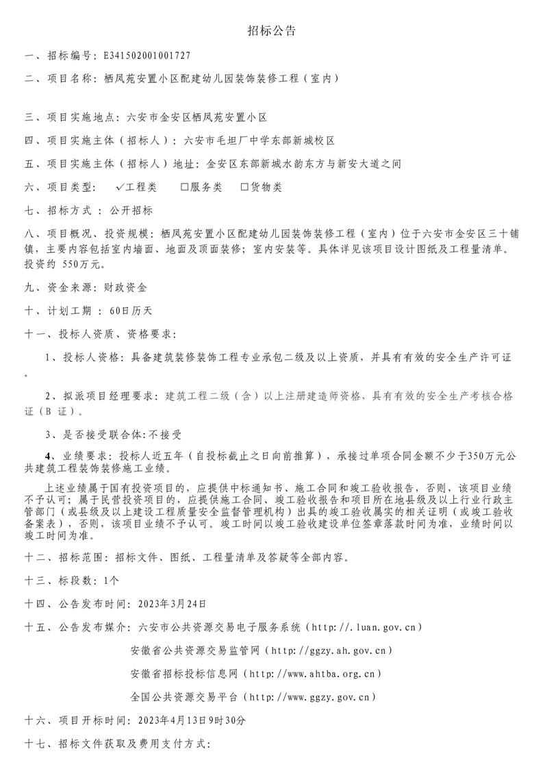栖凤苑安置小区配建幼儿园装饰装修工程(室内)的招标公告