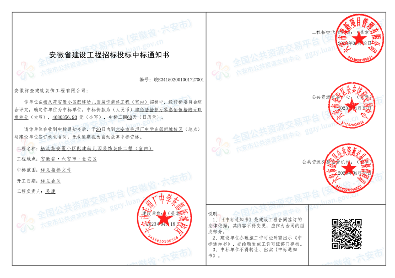 栖凤苑安置小区配建幼儿园装饰装修工程(室内)的中标通知书