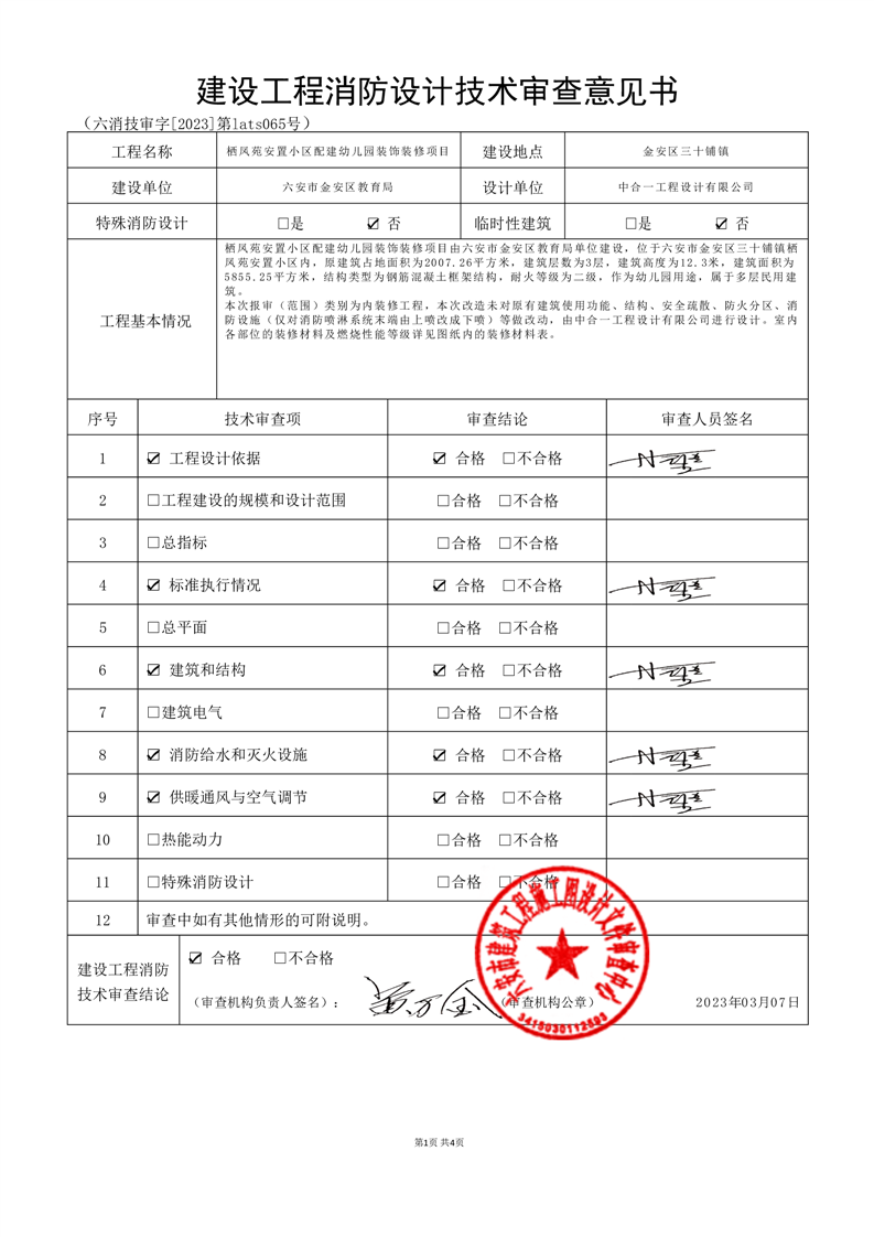 栖凤苑安置小区配建幼儿园装饰装修工程(室内)的消防设计技术审查意见书