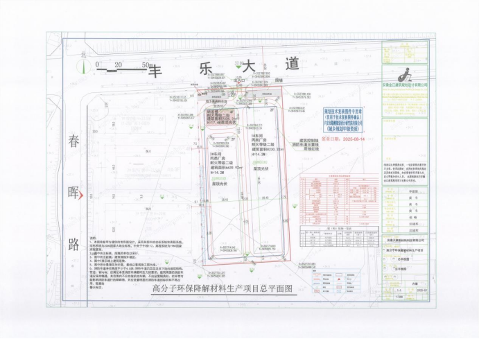 安徽天聚新材料科技有限公司高分子环保降解材料生产项目,位于城北镇丰乐大道以南、安升以东。该项目总用地面积为15000.00㎡;总建筑面积为17211.64㎡;计容总建筑面积为24192.36㎡;容积率为1.61;建筑密度为52.70%;绿地率为1.79%。