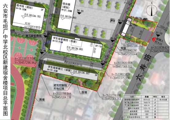 六安市毛坦厂中学北校区新建学生宿舍楼项目建筑方案已经区生态环境保护(自然资源和规划)委员会研究同意,位于木厂镇G237(六寿路)西侧。该项目新建学生宿舍楼为地上5层、地下1层,占地面积1151.70㎡,建筑面积8074.02㎡。