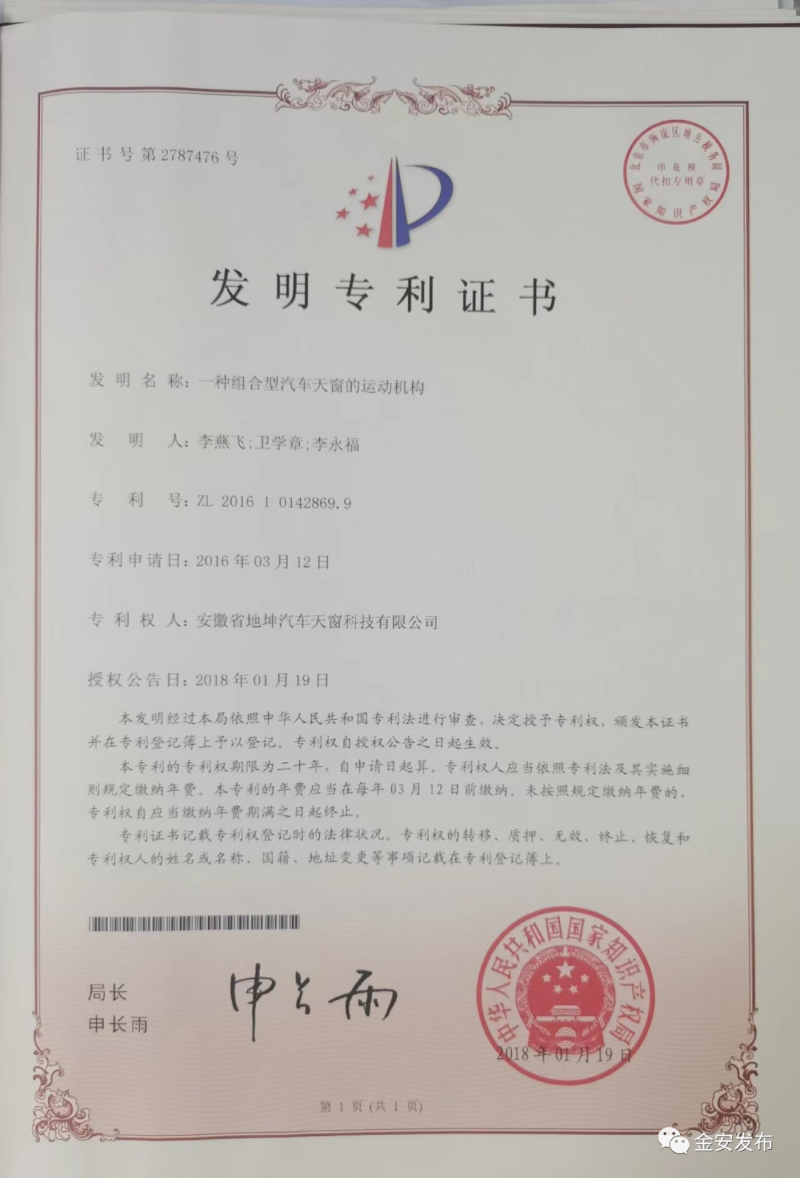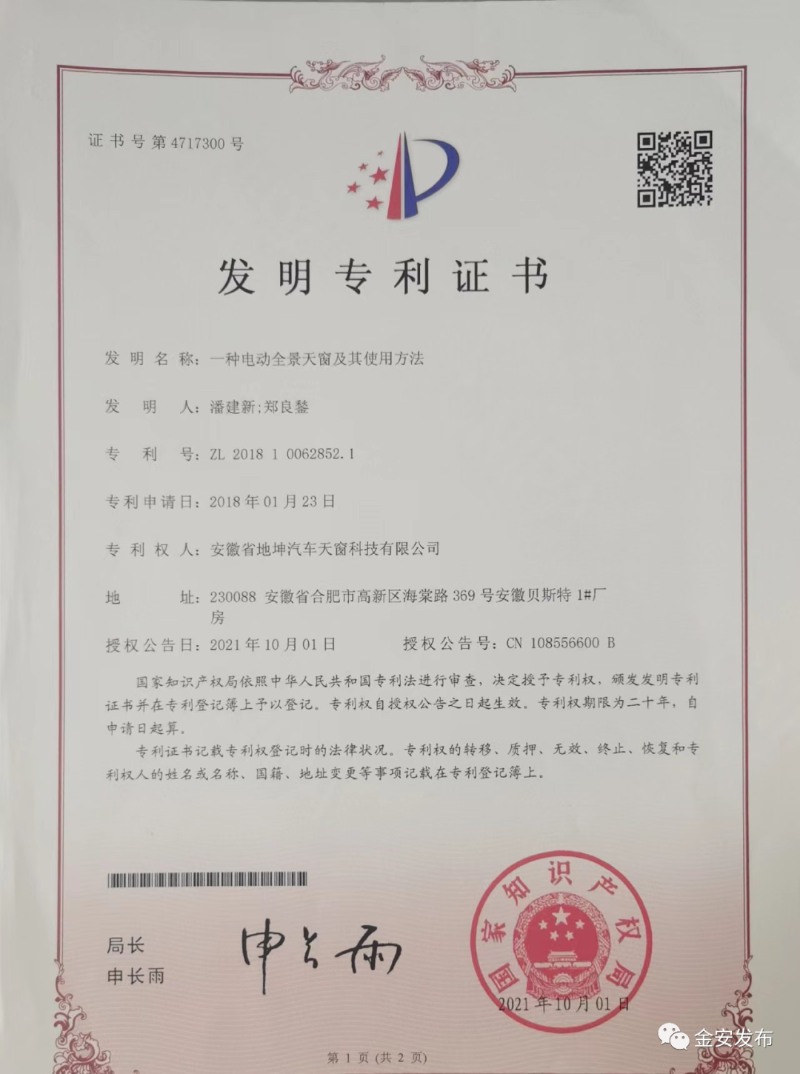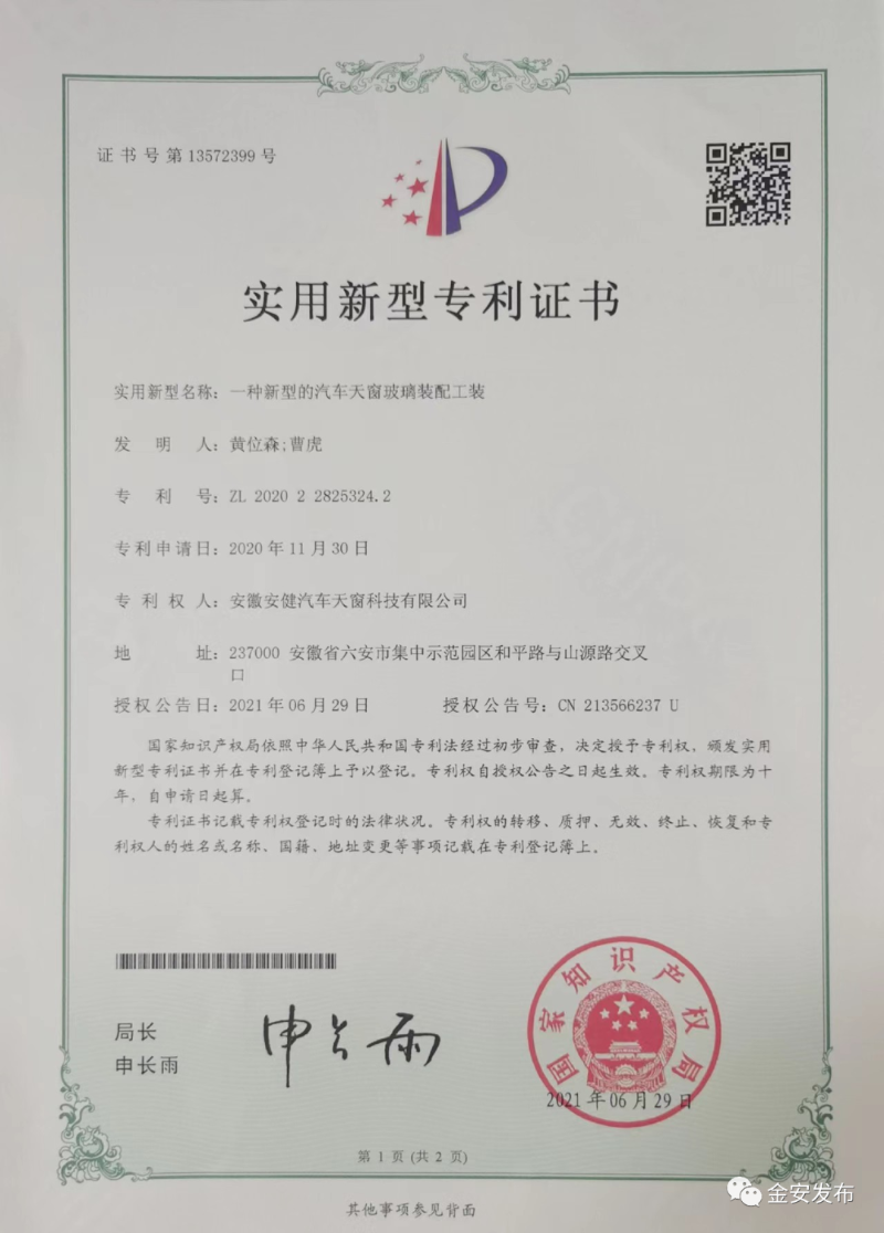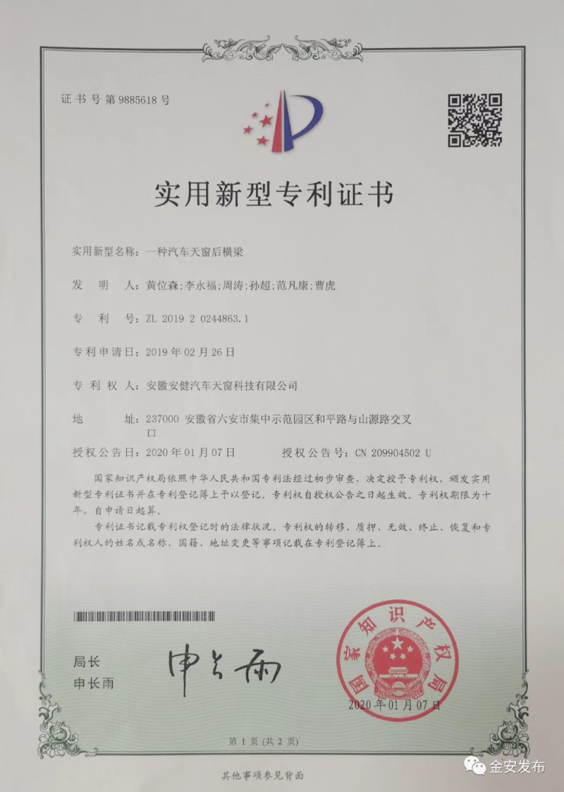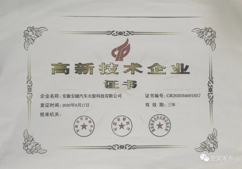 安徽安健汽车天窗科技有限公司成立于2018年10月,位于六安市金安区和平路,注册资金8000万元,国家高新技术企业、省级数字化车间;专业从事汽车智能全景天窗、车顶系统的研发。技术领域涉及汽车车顶系统、汽车内饰材料、生产工艺设计与自动化生产研发。建有独立的企业技术中心;公司目前主要服务于长安汽车、奇瑞汽车、东风汽车、北汽汽车等。